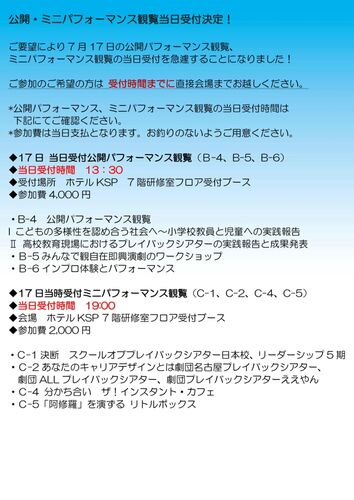 皆様へ。 ご要望により7月17日の公開パフォーマンス観覧、ミニパフォーマンス観覧 の当日受付を急遽することになりました! ご参加のご希望の方は 受付時間までに直接会場までお越しください。公開パフォーマンス、ミニパフォーマンス観覧の当日受付時間は下…