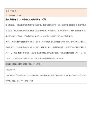 ━━━━━━━━━━━━━━━━━━━━━━━━━ 7月17日 A-1 B-1 D-1 分科会 「初心者のためのプレイバックシアター」 ━━━━━━━━━━━━━━━━━━━━━━━━━ プレイバックシアターに初めて触れる方、体験の浅い方を対象とした2日間通しの分科会です。基本となる理念や手法が紹介されるほ…
